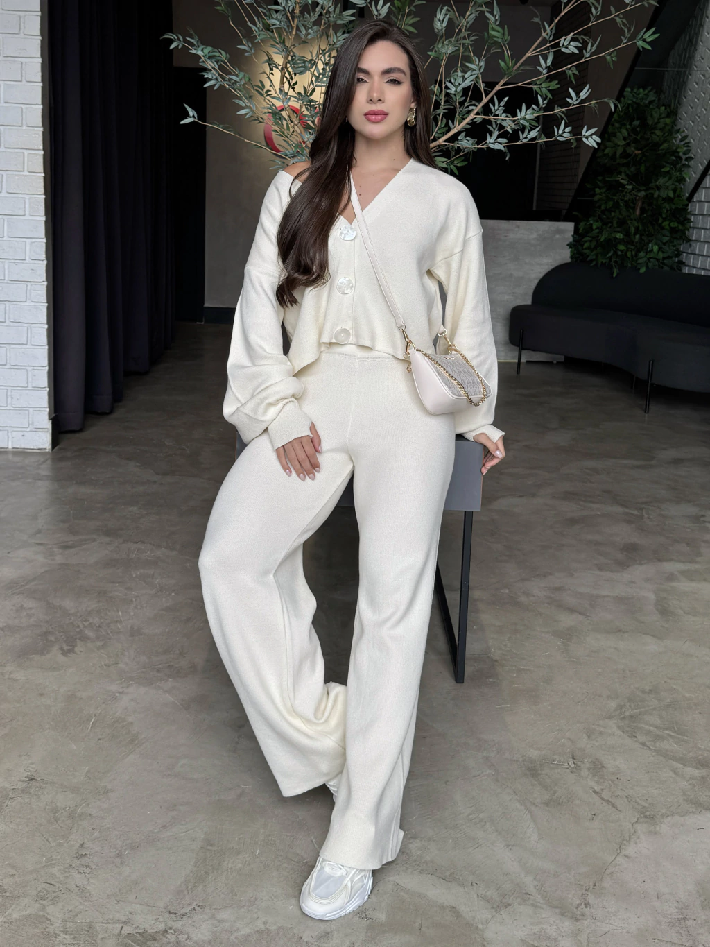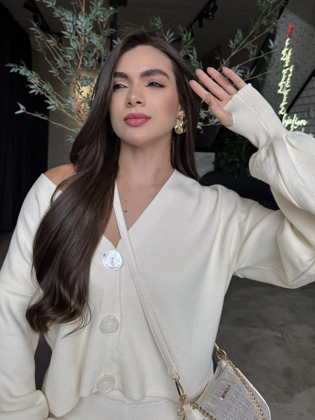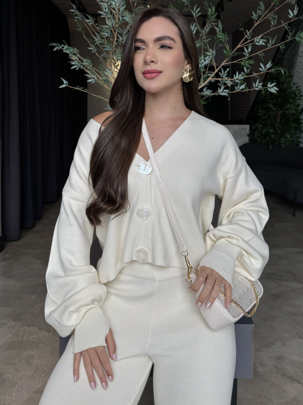 O cardigã com botões encorpados e mangas amplas adiciona charme e movimento, enquanto a calça de modelagem reta alonga a silhueta, garantindo um visual chic e atemporal. Ideal para quem ama estar bem-vestida em qualquer ocasião — seja para um compromisso casual ou um look elegante de viagem.