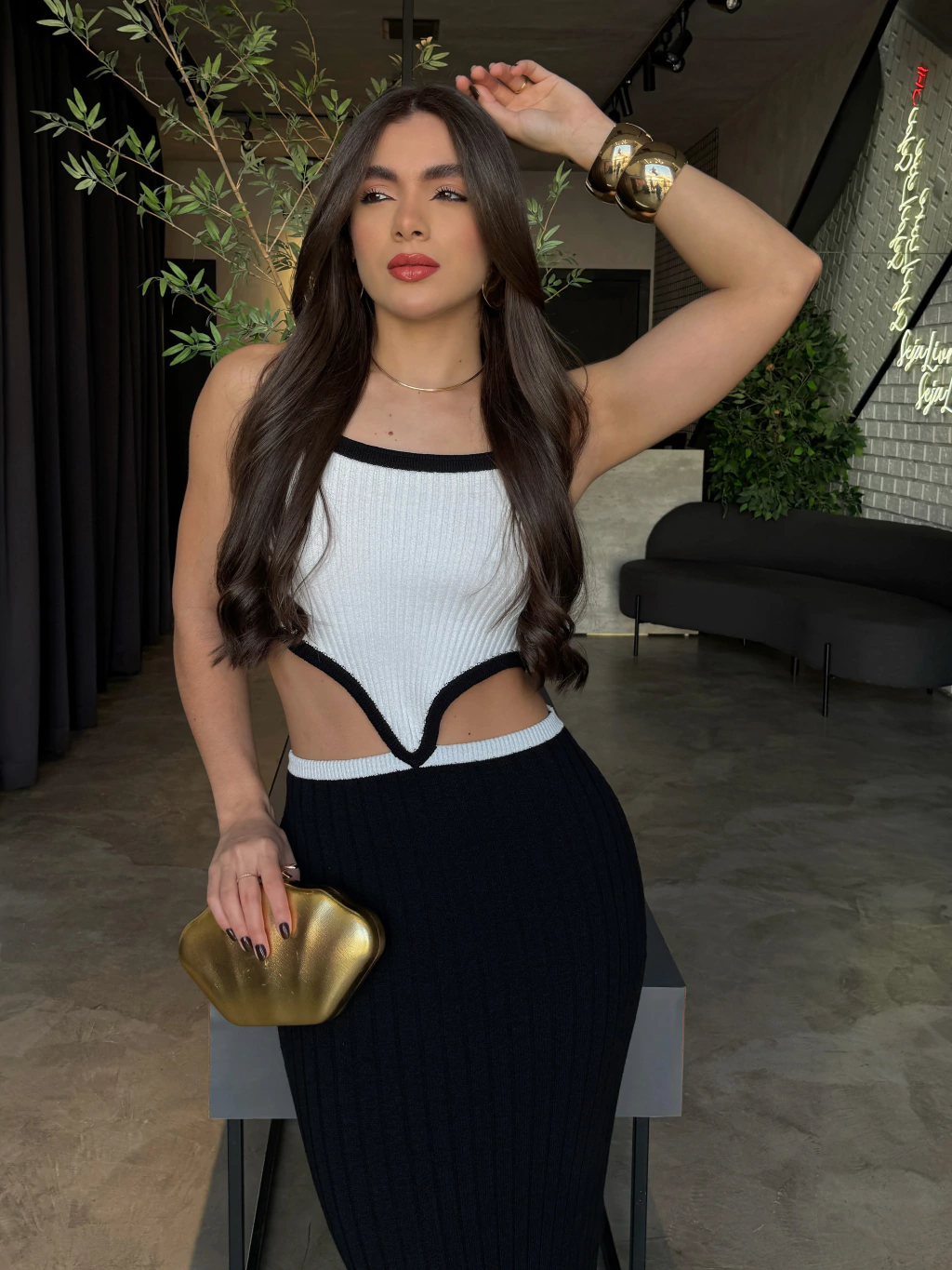 O Vestido Leah em tricô modal é a perfeita combinação do clássico preto & branco com uma proposta moderna e refinada. Sua modelagem cuidadosamente desenhada valoriza a silhueta feminina, enquanto os recortes estratégicos na cintura revelam uma sensualidade sutil, sem abrir mão da elegância.