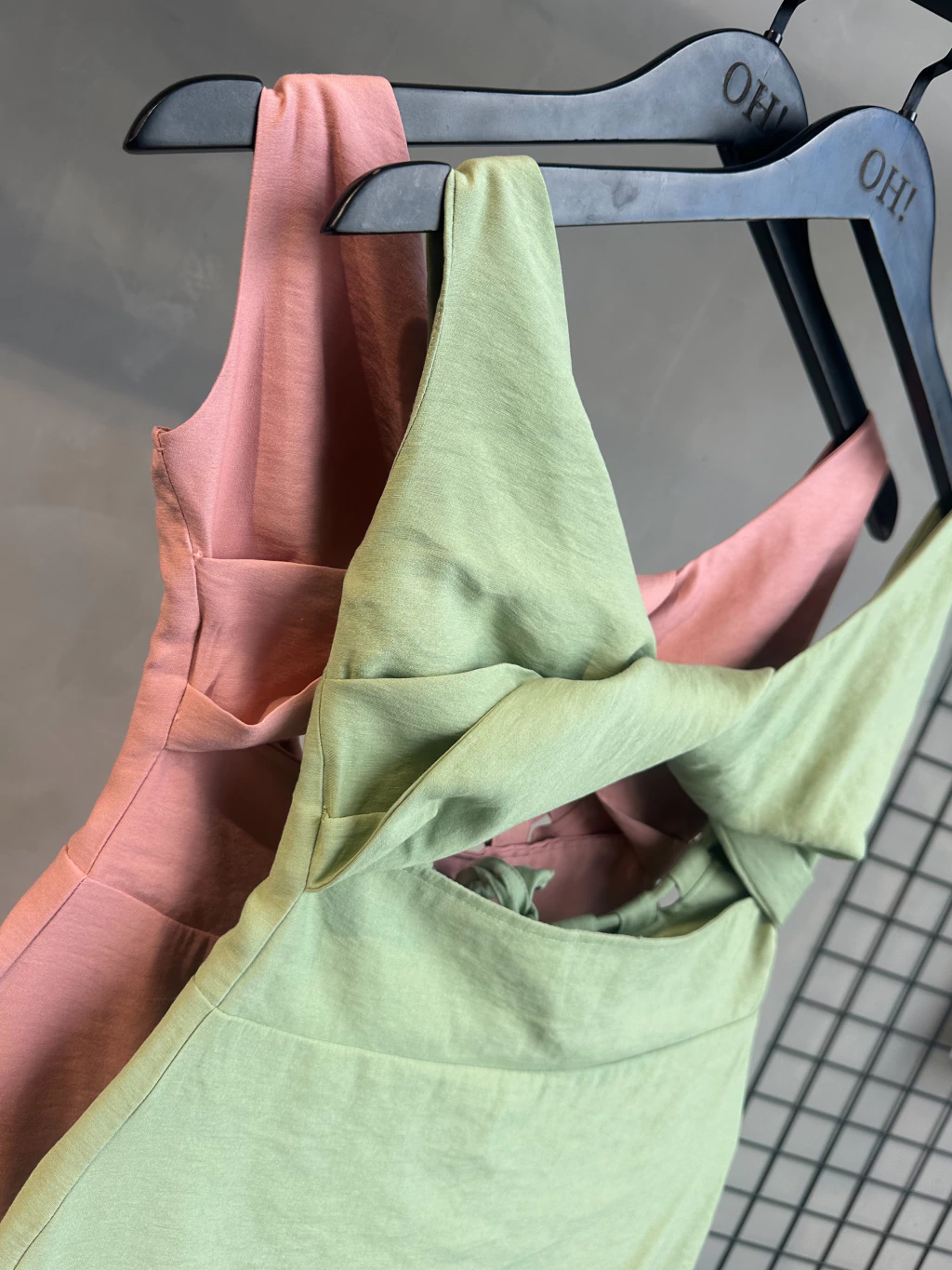 O decote torcido com delicada abertura frontal valoriza o colo com sutileza, enquanto o destaque absoluto fica para as costas: um decote profundo com amarração ajustável que garante caimento perfeito e um visual surpreendente.